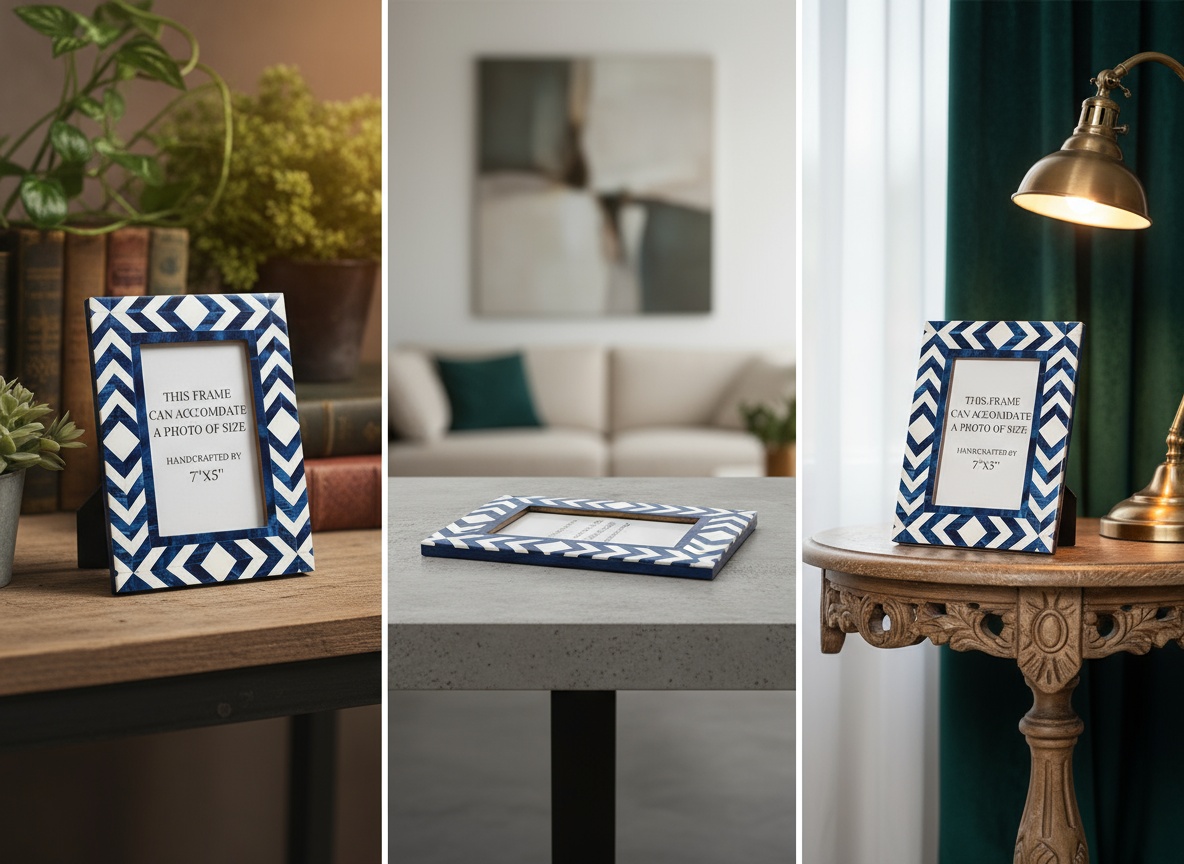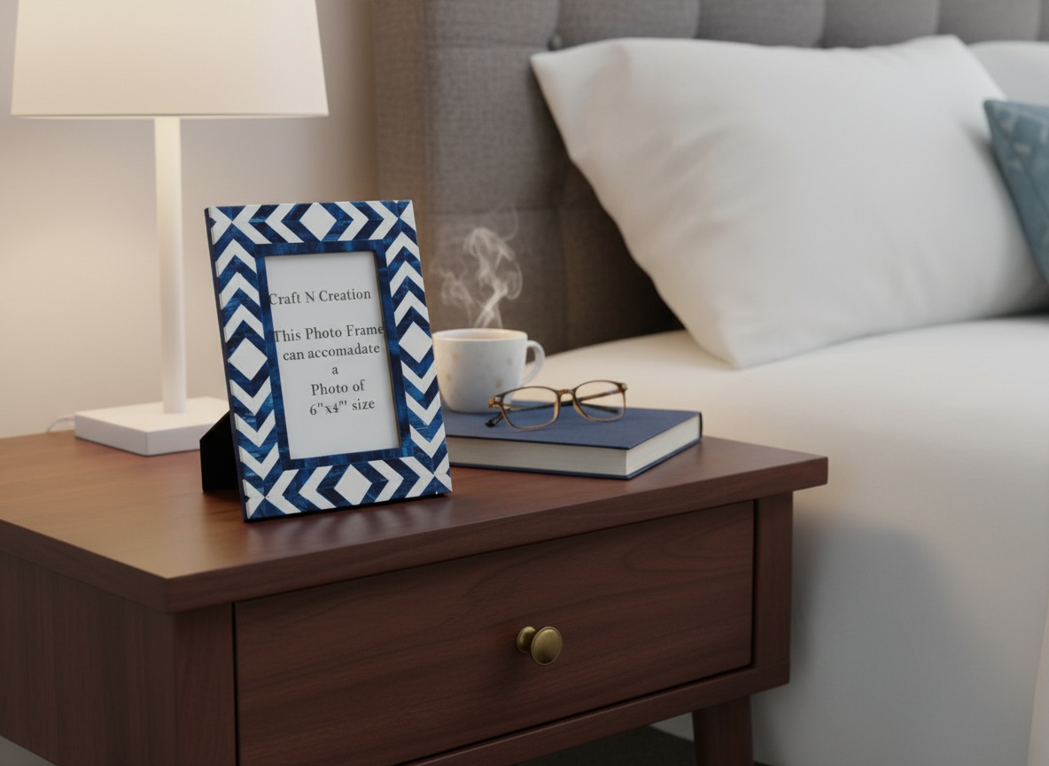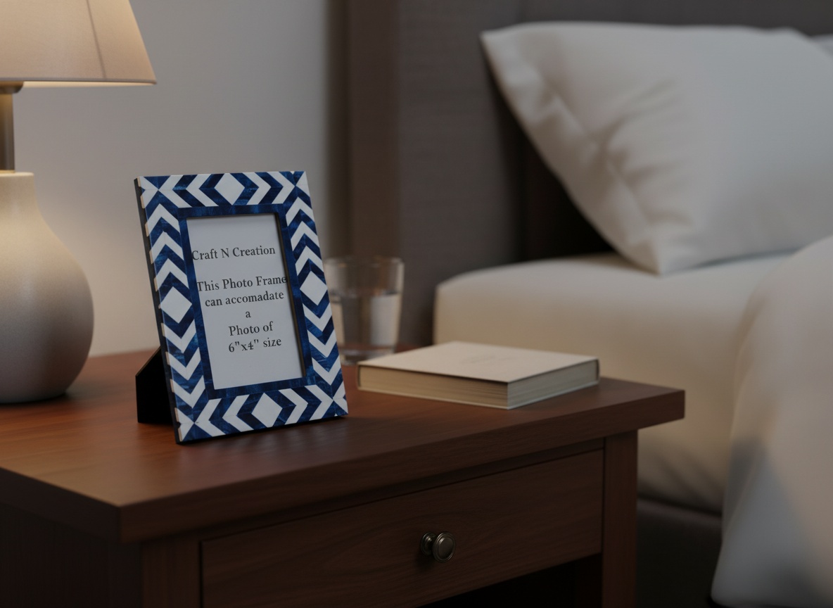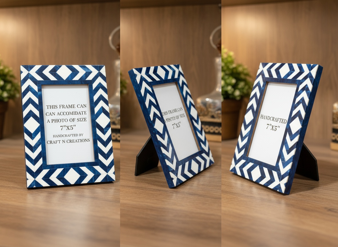 Handcrafted with precision, this elegant frame features a stunning blue-and-white geometric pattern that adds a modern yet artistic touch to your décor. Perfect for showcasing your cherished 7″x5″ photographs, it beautifully complements any space — from cozy bedrooms to stylish living rooms. Crafted from premium materials, this frame is not just a holder of photos, but a piece of art that reflects your taste and style. Display your memories in elegance and let your home décor tell your story.