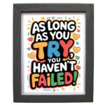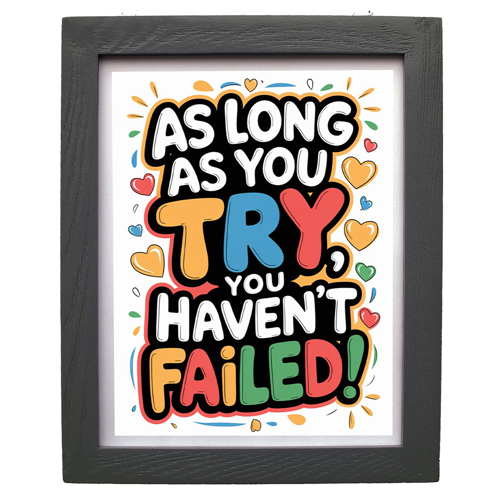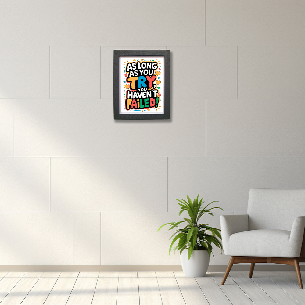 Transform your space with this eye-catching motivational wall art that features the empowering message ‘As Long As You Try, You Haven’t Failed!’ in vibrant, playful typography. The artwork comes beautifully displayed in a sophisticated black frame, measuring 30 x 25 centimetres – perfect for any room where you need a daily dose of inspiration. The colourful design incorporates cheerful hearts and decorative elements in shades of orange, blue, red, and green, creating a visually striking piece that stands out against the clean white background. The sturdy frame provides a professional finish while protecting your print. This uplifting piece of wall décor is ideal for home offices, study rooms, children’s bedrooms, or any space where motivation and positivity are welcome. The contemporary design and encouraging message make it a thoughtful gift for students, professionals, or anyone embarking on new challenges.