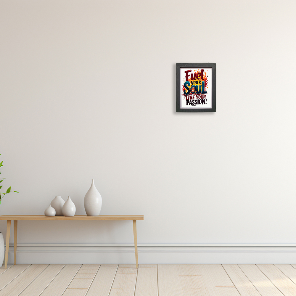 Transform your space with this powerful motivational wall art that ignites inspiration every day. The striking typography design features the empowering message ‘Fuel Your Soul Live Your Passion’ rendered in vibrant colours against a dynamic background of flames and stars. Measuring 30 x 25 centimetres, this art print comes professionally mounted in a sleek black frame that adds sophistication to any room. The bold colour palette of deep reds, energetic oranges, and rich teals creates an eye-catching visual impact that demands attention. Perfect for your home office, workspace, or any area where you need a daily dose of motivation. The high-quality print and durable frame construction ensure lasting beauty and impact. Make a statement in your space with this compelling piece that serves as a constant reminder to pursue your dreams with passion and purpose.