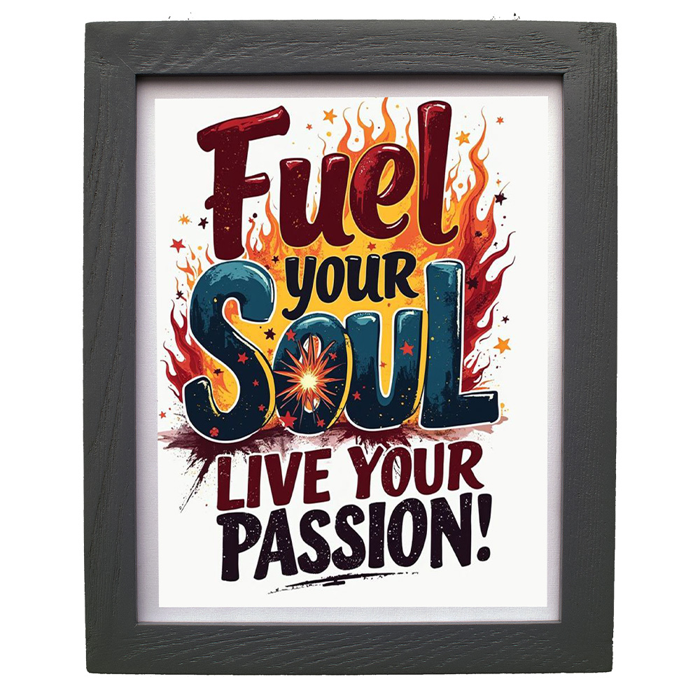 - INSPIRATIONAL MESSAGE: Bold typography showcasing ‘Fuel Your Soul, Live Your Passion’ message in eye-catching red and teal colours with fiery elements