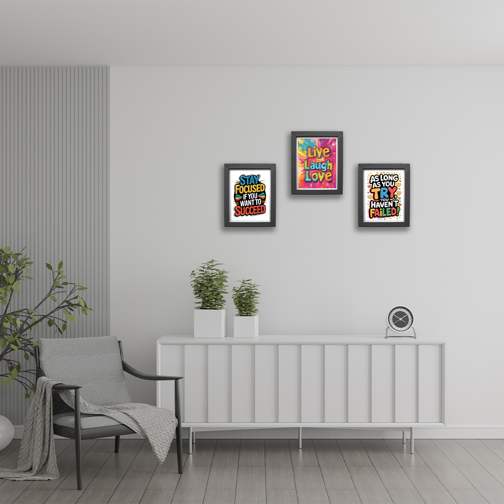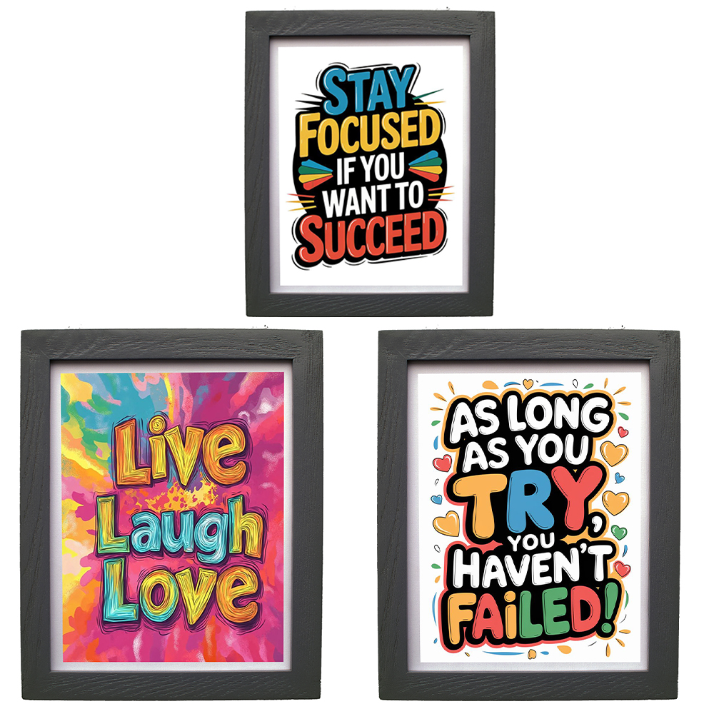 Transform your space with this vibrant set of three motivational wall art prints from CRAFT N CREATIONS. Each print measures 30 x 25 cm and features bold, contemporary typography designs with uplifting messages like ‘Live Laugh Love’, ‘As Long as You Try, You Haven’t Failed’, and ‘Stay Focused if You Want to Succeed’. The artwork showcases dynamic colour combinations including vibrant turquoise, orange, yellow, and pink hues that pop against clean white backgrounds. Each piece comes professionally framed in a sleek black frame that adds a sophisticated touch to the playful designs. Perfect for home offices, study rooms, classrooms, or any space that could use a dose of daily inspiration. The eye-catching designs and positive messages make these prints ideal for creating an encouraging atmosphere in your living or working space.