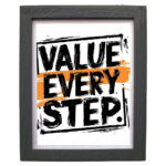 - DESIGN: Bold typographic motivational artwork featuring ‘Value Every Step’ message in striking black and orange colours
