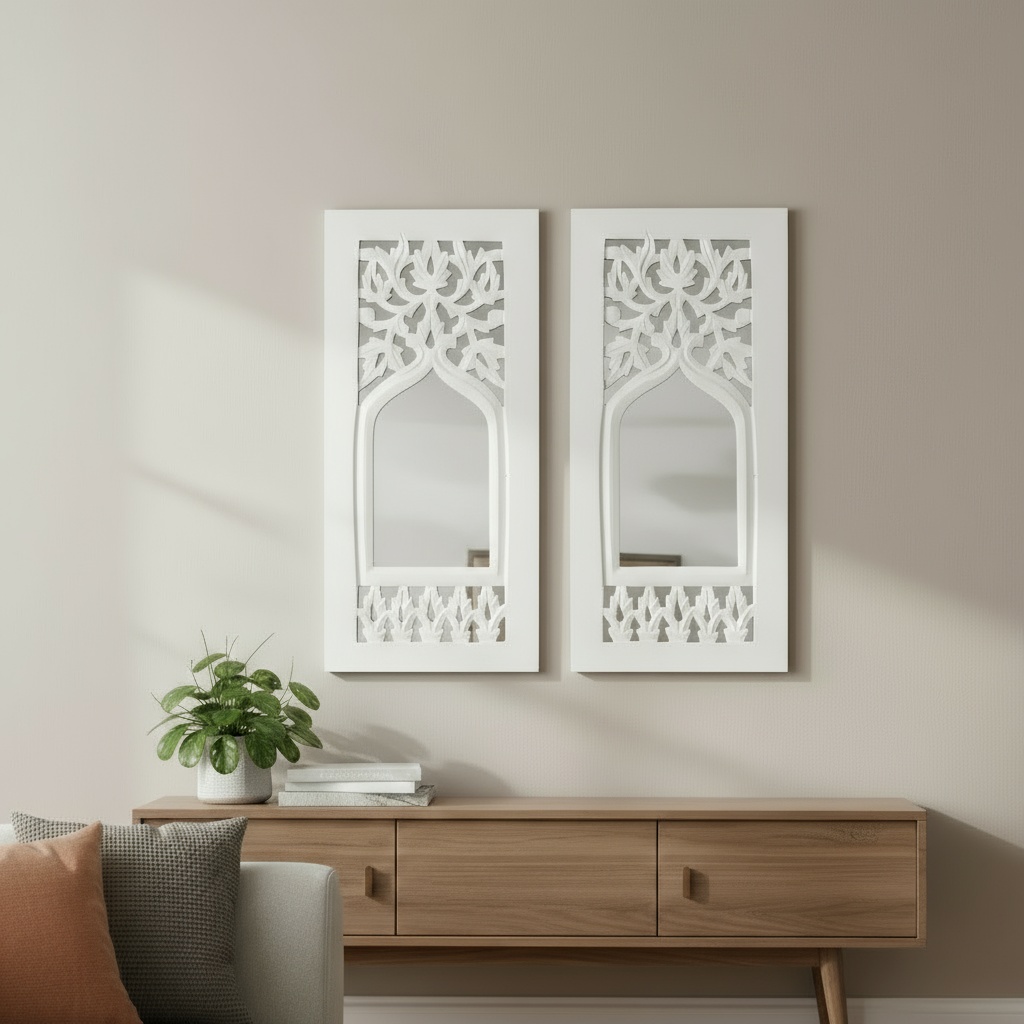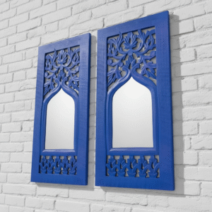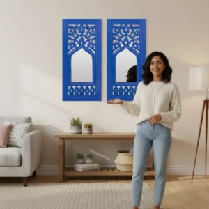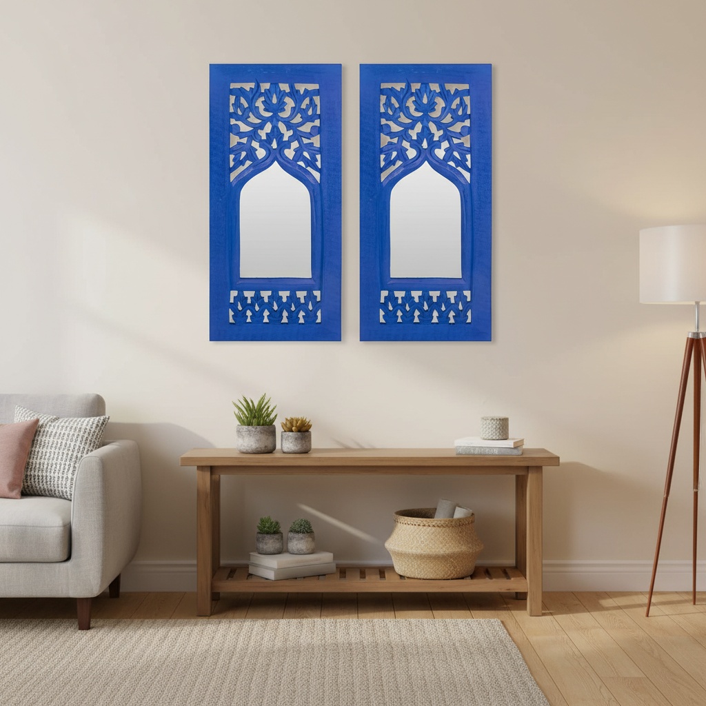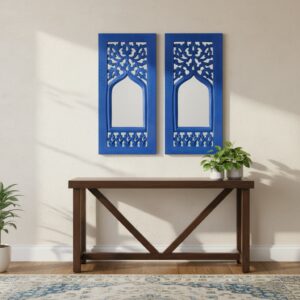 Transform your living space with these exquisite Wooden Jharokha Mirror Wall Panels in Royal Blue. This set of 2 traditional Indian-style decorative panels features intricate carved designs that add a regal touch to any room. The elegant arch-shaped frames showcase detailed geometric patterns and delicate lattice work, reminiscent of classic palace architecture. The mirror centres beautifully reflect light while creating an illusion of expanded space. These versatile wall panels can serve as striking focal points in your living room, bedroom, or entryway. The rich royal blue finish adds a bold, contemporary twist to the traditional design, making it perfect for both modern and classical interiors. Each panel’s thoughtful craftsmanship highlights the ornate details that are characteristic of traditional Indian architectural elements. These decorative pieces not only serve as beautiful wall art but also bring a touch of cultural heritage to your home décor. The panels are ideal for creating a symmetrical display and can be arranged to suit your space and style preferences.
