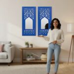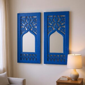 • TRADITIONAL DESIGN: Beautiful wooden jharokha-style wall panels featuring intricate carved patterns and elegant arch-shaped mirrors in royal blue finish